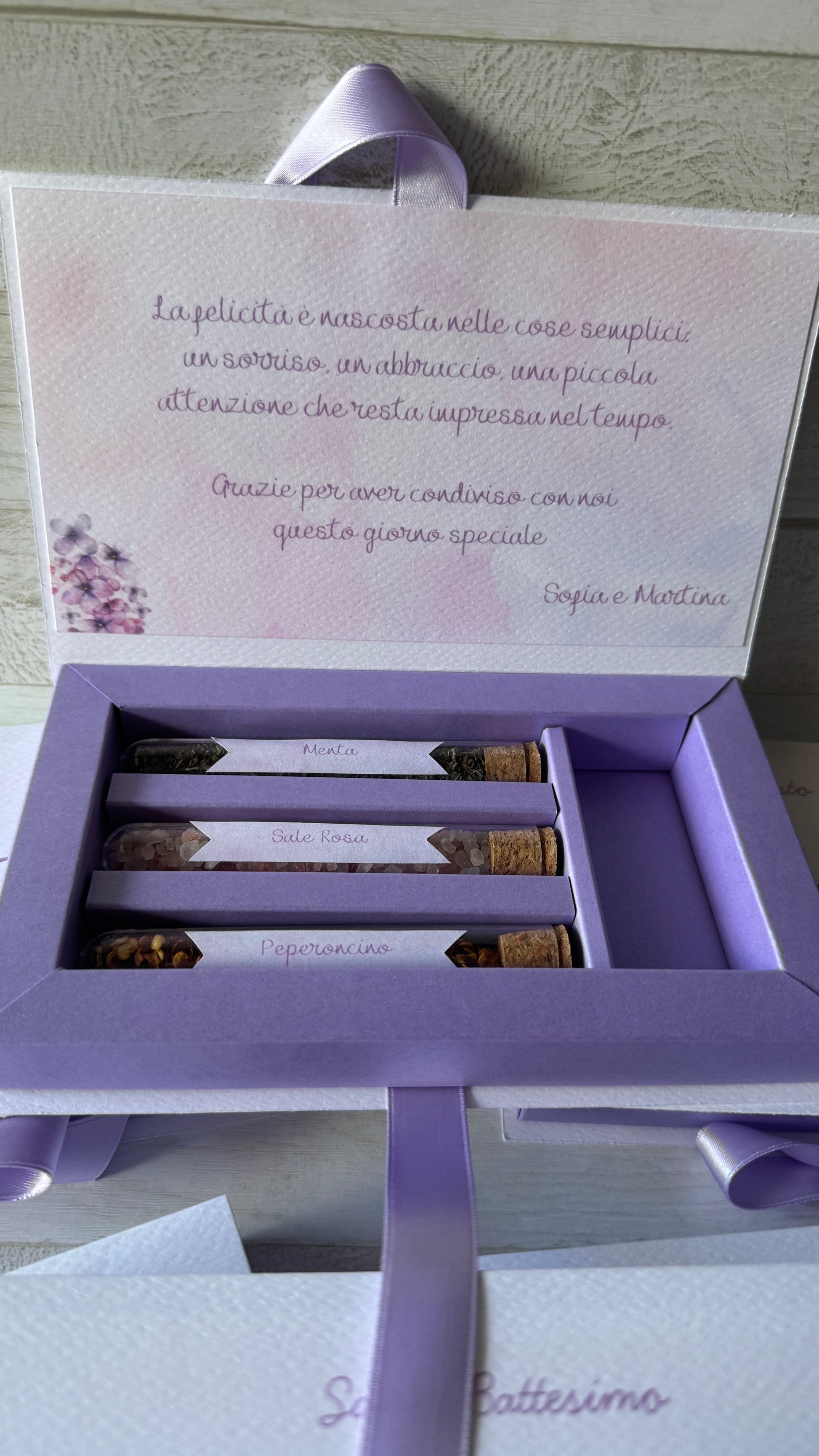 - testi personalizzati : è possibile inserire liberamente la frase all'interno della confezione. Solitamente viene scelta una frase/aforisma oppure una frase di ringraziamento, entrambe personalizzabili.