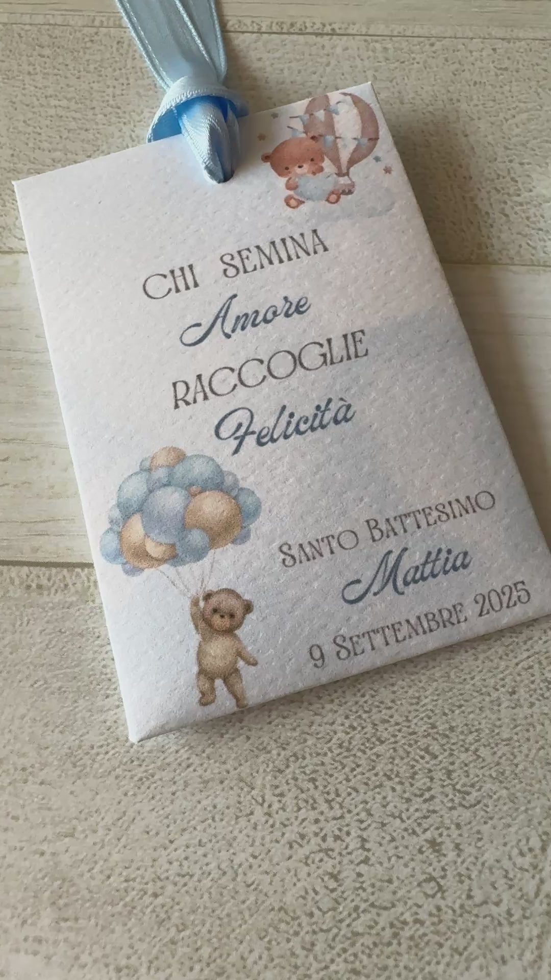 Bustina semi con tag nominativo applicato al nastro