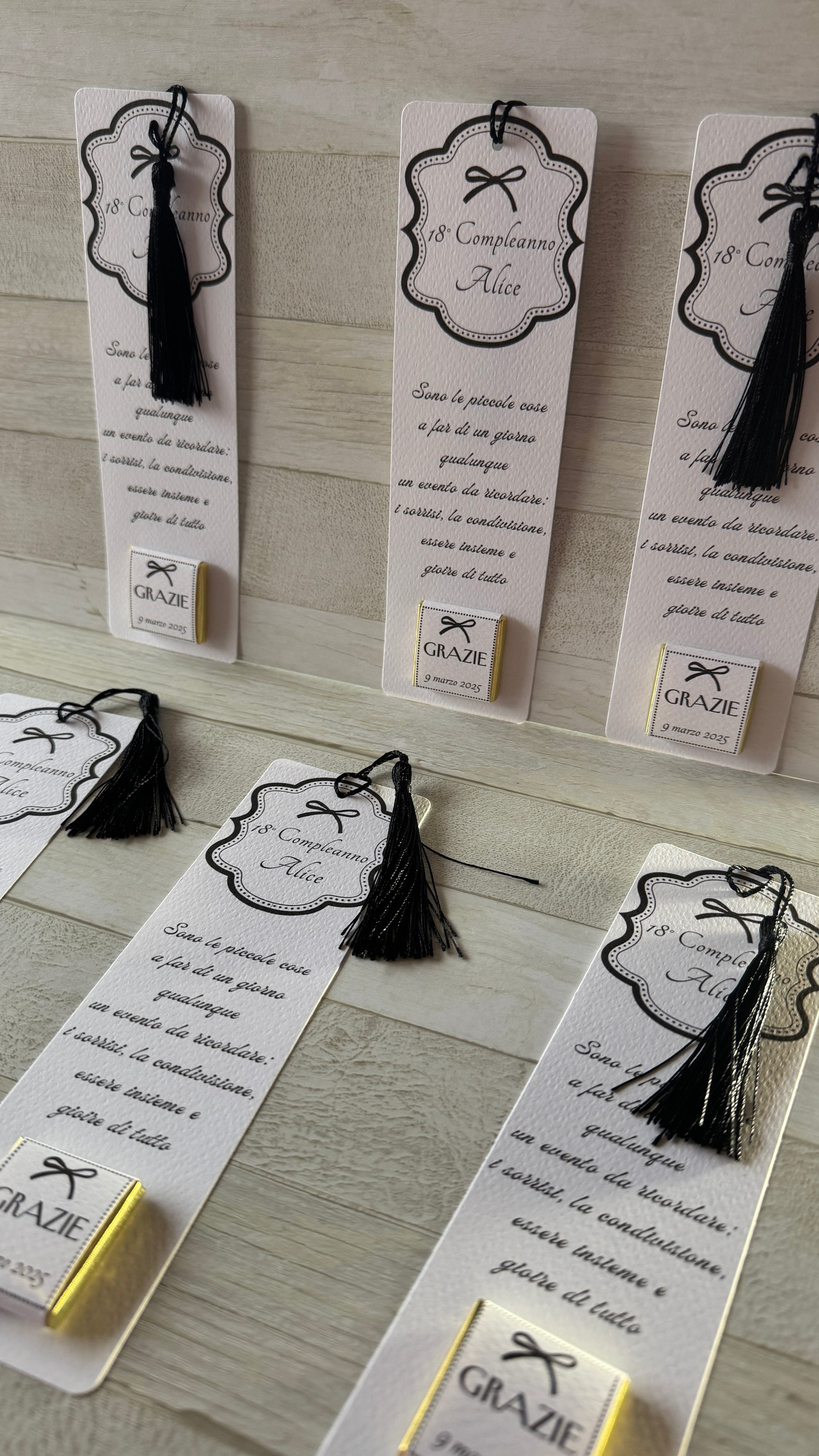 - testi personalizzati: nome, data, frase o messaggio di ringraziamento